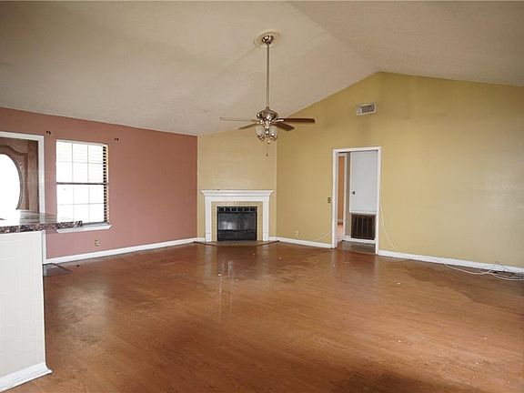 Open concept living room with Fireplace, dining room and kitchen with lots of counter space.