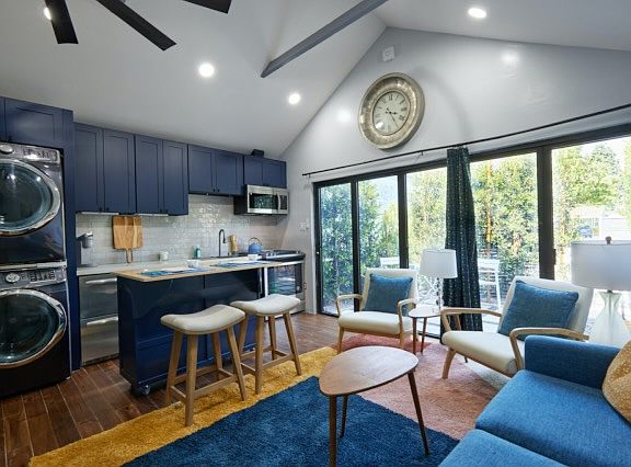 Private patioEntertainment islandFlexible living spaceRich hardwood floorsFull-size washer and dryerDesigner ceiling fanSplit hvac system