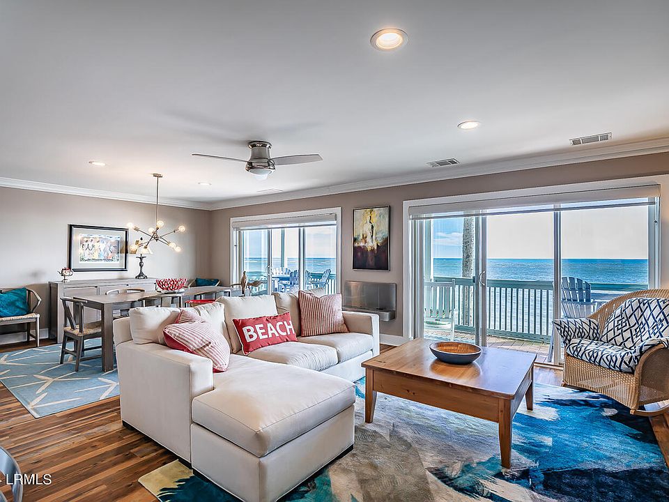 SPECTACULAR OCEANVIEWS come with this stunning condo. The front door leads you to a new world of living. Enjoy amazing, unobstructive views of sun & moonrises over the ocean. Relax on one of the few condos w/ an elevated, double long porch while watching & spotting a dolphin w/ morning coffee. A well-appointed kitchen w/ granite counter tops, stainless steel appliances and a pantry. Sit at the kitchen bar area for three or at the round table in the breakfast area w/ a bay window. The twin bedroom has built in bookcases & a barn door for the closet. The 2nd bedroom is a spacious bedroom with a queen bed. The two bedrooms share a bathroom shower/tub combo & granite counter vanity. The master bedroom is sitting on the ocean with a large oceanfront window. Ensuite has a large tile shower & double sink vanity with ceramic tile flooring. The family room area is also perfect and the center of the heart of the whole home. Adjoining spacious dining room with a stainless-steel wall fireplace which runs on a small gas cylinder. (Owners just have never used it.) Crown molding throughout the home. Storage unit outside by the front door maybe shared. You will never want to leave this condo. The ever-changing tides and views are absolutely amazing. You even have a nice view of the Hunting Island Lighthouse. This condo is all on one level.