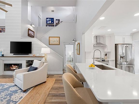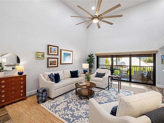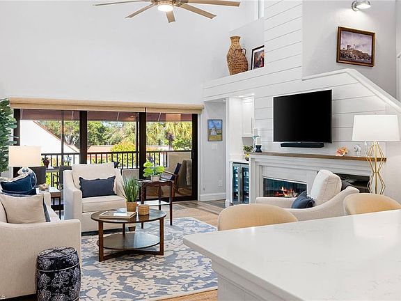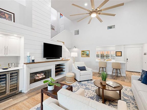 Fully updated, light and airy three-bedroom three-bath multi-level condominium with tasteful coastal finishes. In the desired south end of Pelican Bay and lives like a private villa with a second-floor entrance and soaring 16-foot cathedral ceilings. Walk to Waterside Shops, dining, Artis-Naples and Baker Museum. Offered turnkey with exclusions. Featuring a new kitchen with quartz countertops, soft-close cabinetry, and Bosch & GE Café appliances. A large owner's suite offers a spa-like bath with soaking tub, frameless glass shower, double vanity and dual walk-in closets. A junior suite and third bedroom with updated bath. The living room includes a fireplace, beverage cooler, impact glass sliders opening to a private lanai overlooking a peaceful lagoon, water feature, and one of two community pools. Extras include custom shutters, HVAC air purifier, new roof, updated electrical and fresh exterior paint. Pet-friendly and charming home in amenity-rich Pelican Bay with private beachfront cabana service, dining, tennis/pickleball, fitness and vibrant social scene. It's all ready for you! Just pack your sunscreen.