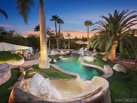Enjoy the privacy and serenity of your own tropical oasis! Surrounded by lush landscaping and shade palms, this sprawling 0.52 acre lot features a salt water pool with spa and slide, a rolling terraced yard with detailed stone work, a fire pit, built-in BBQ and landscape lighting. The 5-hole putting green makes this the entertainer’s dream! This spacious 3,306 SF home brings the outside in with soaring ceilings and abundant natural light. The bright open kitchen has plentiful cabinet and counter space, tiled backsplash, recessed lighting, a palatial primary retreat, modern baths and first floor bedroom and full bath plus solar. The backyard features citrus & fruit trees, space for RVs, toys and gardening. SEE SUPPLEMENT!