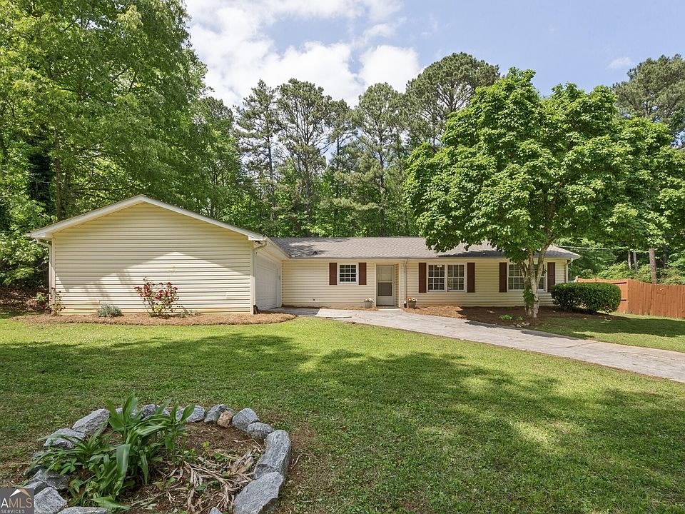 This Stone Mountain one-story home (no steps!) offers location, privacy and a great investment opportunity, with a two-car garage and a deep partially wooded half-acre lot. Choose your private back porch or backyard for morning coffee or evening wind-down. The peaceful backyard features a dog run, blueberry bushes and a view of trees along the back lot line. The half-acre lot is deep enough to add a garden, a pool, or to play ball. In 2022, the owner made substantial improvements. Carport is now a garage with utility room and a side door leading to the kitchen and laundry area. French drains and river rock direct water away from the house. New roof with transferable warranty, new water heater, new interior LVP, and renovated kitchen with new white cabinets, granite countertops and a breakfast bar! Since then, newer improvements include plumbing, electrical, a transferable termite bond, and new smoke/carbon monoxide alarms. Quiet neighborhood, close to schools and only 10 minutes from Stone Mountain Park, Stone Mountain Village, and Wade Walker Park and YMCA. Avoid freeway traffic by taking Rockbridge Rd. straight to Avondale Estates, Emory or Decatur.