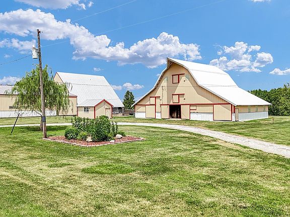 Welcome to a one-of-a-kind rural retreat that offers the best of country living! Nestled on 9.4 beautifully maintained acres, this property is more than just a home-it's a lifestyle. The charming farmhouse-style home features warm, welcoming spaces filled with natural light and vintage character. Enjoy views of the countryside from nearly every room, with cozy touches like arched doorways, a sun-drenched sitting area, and a classic fireplace. Outside, the real showstoppers are the outbuildings. The iconic red-trimmed barn brings timeless beauty and function, while the massive shop is ready for all your hobbies, projects, or storage needs. Whether you dream of hosting events, housing animals, or running your own business, you've got the space to do it all. Wide open fields surround the home, giving you postcard-worthy views in every direction. From sunrise to sunset, the peaceful setting is simply unbeatable. This is your chance to own a little slice of the Midwest-with room to grow, play, work, or just breathe. Don't miss out! Call today to schedule a private showing.