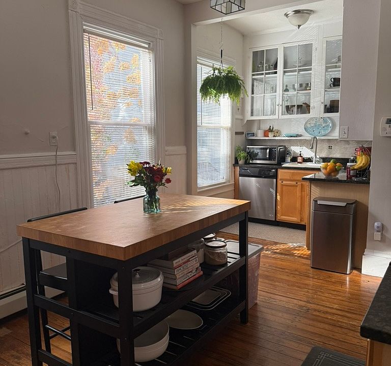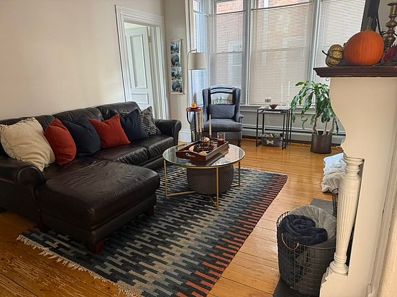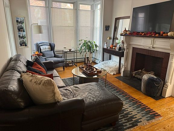 This spacious 3-bedroom, 1-bath home spans the entire first floor of a classic Victorian, blending historic character with modern comfort. Large windows, hardwood floors, crown molding, and box windows fill the space with natural light and timeless elegance. A formal dining room provides the perfect setting for gatherings, while the cozy gas fireplace adds warmth and atmosphere.
