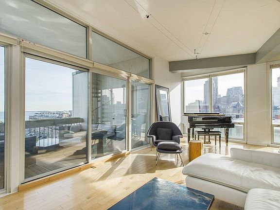 Spectacular one of a kind corner residence with stunning views of Boston Harbor and Skyline. This pristine loft-style home features direct elevator access, an expansive private terrace overlooking the harbor and deeded garage parking. The open kitchen has custom cabinetry, granite countertops and breakfast bar which opens into grand living room complete with floor to ceiling windows. There is ample storage in the unit located in large loft space accessed via spiral staircase. Includes wall mounted TV, Sonos sound system and in-unit washer/dryer. The Prince Building is a professionally manages property located on the primary footpath of the Waterfront and steps to the North End, Christopher Columbus Park, Faneuil Hall and all major points of transportation.