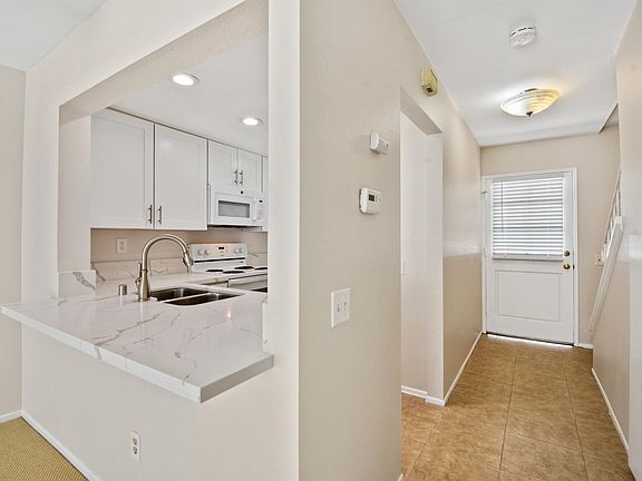 Two story townhome with a Gorgeous remodeled kitchen, big comfortable living room, good sized bedrooms and a lovely large enclosed patio. Pool nearby, walking distance to great shops, market and restaurants. Parking for two cars - covered carport number 1 and parking space number 1. This is a great price for this lovely home!