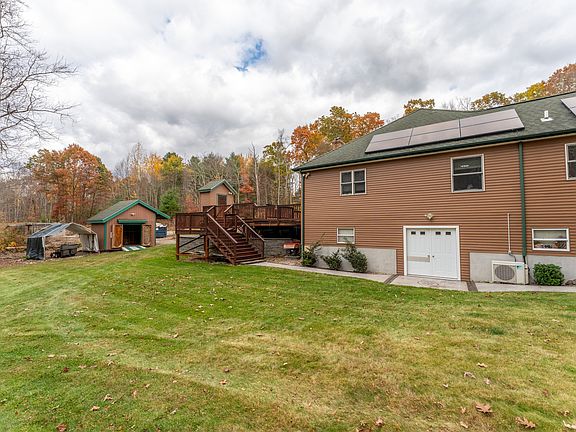 Experience the best of country living and modern design, all on 10 private acres, ideal for hunting and outdoor recreation. This stunning single-level ranch, with a 3 car garage offers an open-concept floor plan, filled with natural light, featuring gleaming hardwood floors, spacious kitchen with stainless steel appliances and a 32 x 27 great room - perfect for entertaining or family gatherings. Home offers a large primary suite with walk-in closet and a private full bath, complimented by 2 additional generously sized bedrooms and a 2nd full bath. Stay cozy with 2 wood stoves as a supplemental heat source or enjoy year-round comfort with 2 mini splits for heating and cooling. Home boasts 39 energy efficient solar panels, which are owned and paid-in-full! Home also offers 2 oil tanks, a 1500 gallon septic tank and a generator hookup for peace of mind. Outside, relax by the above-ground pool, entertain on the large deck, and take in the tranquility of your private retreat. This Canterbury property delivers it all!