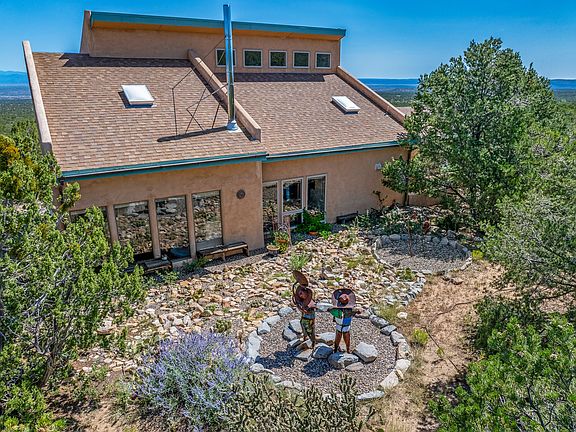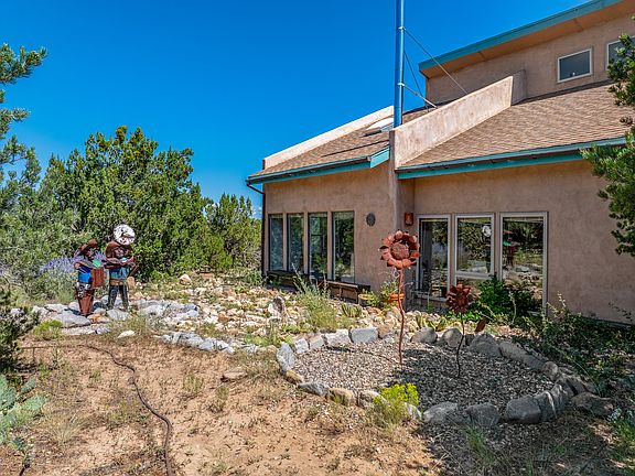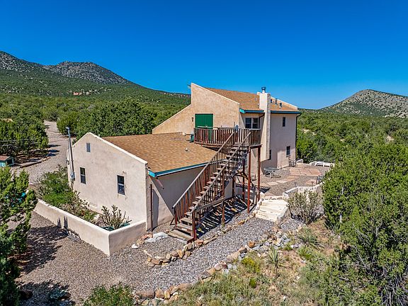 Sited high on the northern slopes of the Ortiz Mountains, this working artist's retreat offers away-from-it-all serenity while still being with an easy commute of Santa Fe. The home and studio is centered on a gently sloping 15.59 acre lot that offers space for gardening, horses, other animals, or outbuildings. The home features three bedrooms and two full baths, with soaring ceilings in the living room and kitchen, and a primary bedroom on the second floor with rooftop deck. Brick and wood floors, wood ceilings, and an interior adobe wall exude warmth. Outside, a north facing patio takes in breathtaking views across the Galisteo Basin to the Sangre de Cristo's. The attached artist's studio has its own entrance and bathroom, and could easily be converted back to its previous use as a guest house if additional living space or rental income was desired. Two storage sheds are on the lot, including a large and sturdy shed that could be used as shop space or more studio space. Connected to public electric, with fast internet and a good well. The property also has a Bed and Breakfast license from Santa Fe County. Owner will offer a $25,000 credit to replace shingle roof with metal roofing, and may offer owner financing with substantial down. 20 miles to the south side of Santa Fe, 57 miles to the Albuquerque airport, and near dining and entertainment opportunities in Madrid and Cerrillos. Accepting back up offers.
