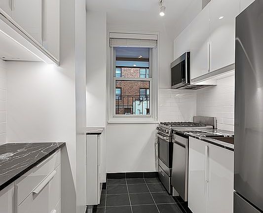 Apartment 2R is accessible by a staircase off of the lobby, much like a maisonette within the building, ideal for those who value the ability to come and go quickly, or that want to take their dog for frequent walks in Washington Square Park. The apartment is one of the largest 1 bedroom lines in the building and has very bright southern exposure. Upon entering you are welcomed by a gracious foyer space with an entry hall closet. The kitchen is brand new with great storage space, high-end appliances, and a breakfast bar or work-from-home station with an under-countertop wine fridge. The dining space and living room are very comfortable and private as the windows are recessed away from the street. The bedroom is absolutely enormous, with space for a king-size bed, work from home station, and a Peloton or workout area. There are two huge closets and a walk-in closet next to the renovated bathroom.