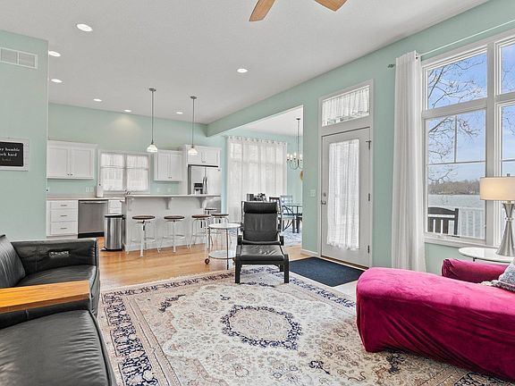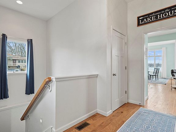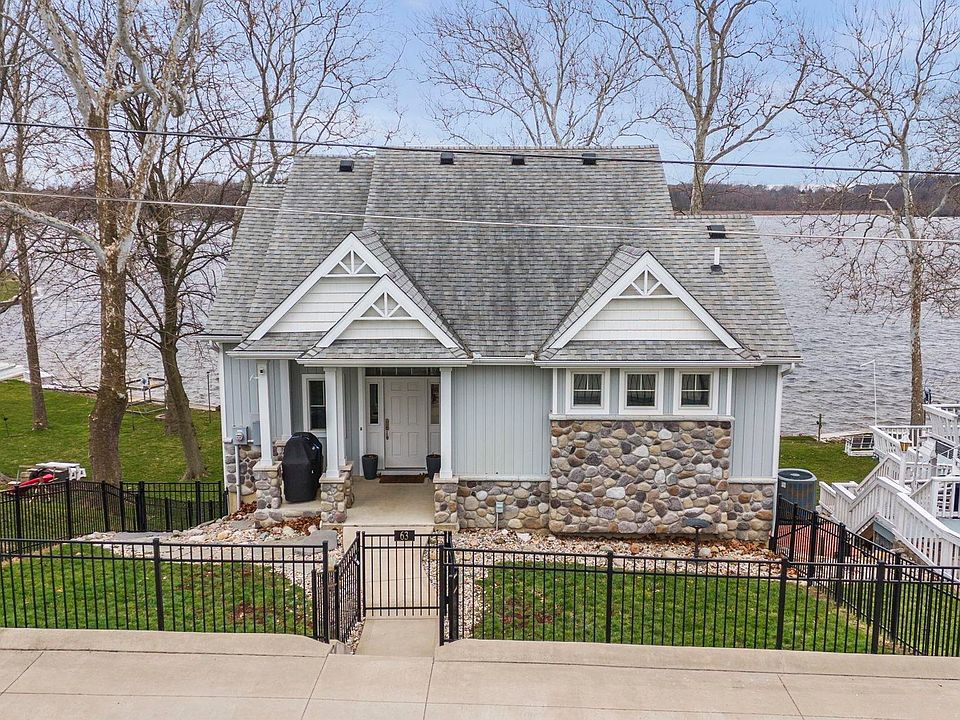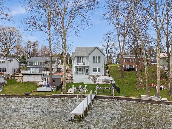 THIS HOME HAS IT ALL!!! The minute you walk through the door you will fall in love with all this beautiful home has to offer. Breath taking views from almost every room and both sunset and sunrise views. 10' ceilings as well as ample windows gives a wonderful open bright and airy feeling. A gorgeous kitchen with a breakfast bar and dining area makes entertaining a delight. For chilly evenings enjoy the newly updated fireplace for warmth and atmosphere. The primary suit offers hardwood floors, bath with double sinks, large shower and spacious walk-in closet. Also on the main level is a powder room and convenient laundry area. Lower level offers a family room large kitchenette with bar and additional bedrooms for family or guests. Convenient outdoor decks are located on both levels. A 12X15 bonus area off of lower level offers storage for lake toys or storm shelter. This property boasts an additional large 40'X30' garage on lot across the street. What a dream to have all of the parking and storage area you could possibly want! 2 large overhead doors, 1 single overhead door plus utility door makes parking boats or cars simple. Lots of cabinets for storage and workshop area. Additionally, it has a 10x12 storage or could be a garden shed. All of this and 50' of lakefront located on the popular Barbee chain of lakes for fun, fishing and enjoyment right out your front door.