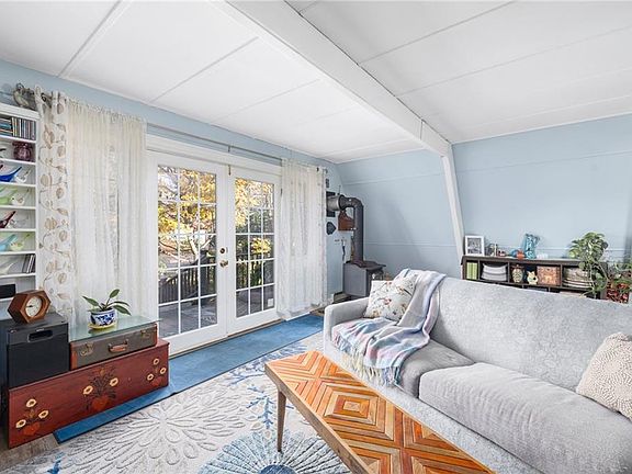 Contemporary shingled Cottage sited on just over 14,000 sq.ft. of outdoor spaces that feel magical! This home has mature landscaping, a cozy shed for relaxing and reading, a greenhouse, a garden shed, comfortable sitting areas, and meandering paths with places to dream! A welcoming front porch greets you, then step inside! A large, open living room with wood burning stove opens onto the dining area and kitchen with newer appliances. A full tiled bath, and nearby sitting room/office could become a small first floor bedroom and leads out to the rear deck and yard. A second floor, accessed by a sturdy spiral staircase, leads to the two present bedrooms. A full basement provides plenty of storage or workspace. Charming details throughout make this an enchanting spot. Close to water access and all Jamestown has to offer.