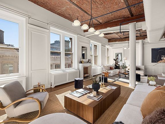 Perched atop a 19th-century former silk showroom in the Cast Iron Historic District, Penthouse A at 63 Greene Street is a one-of-a-kind 4-bedroom, 4-bathroom duplex that combines rich architectural history with luxurious modern living. Spanning nearly 3,600 square feet with a rare 100 feet of frontage along coveted cobblestoned Greene Street, this grand-scale home is capped by a spectacular private rooftop terrace measuring just under 1,000 square feet—ideal for entertaining, sunbathing, or serene alfresco dining under the skyline.
