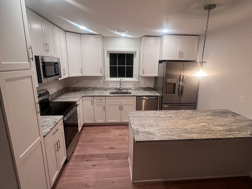 Newly built two-family home Freshly new counter tops New appliances Eat in kitchen Living room Front porch Dishwasher Washer/dryer 1 1/2 bathrooms 3-bedrooms Extra closet space Outside parking Owner pays water, renter responsible for electric and gas bill, 1 month rent and deposit required. No smoking in the home and no pets allowed. Street parking.