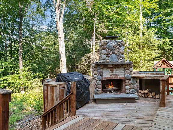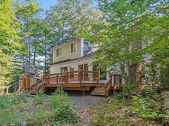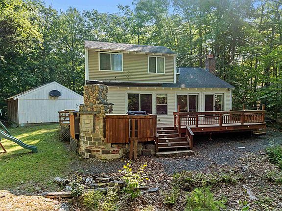 Just steps down to a shared sandy beach with access to lovely Crystal Lake. This cozy two level home has a bright open floor plan with character and charm. The great room has high airy beamed ceilings with skylights, hardwood floors, a rustic knotty pine feature wall with a stone fireplace and a full wall of windows that offer filtered views of the lake. This open area also has a fully applianced kitchen and a dining area. Additionally on the main level there are 2 bedrooms, an updated full bath and laundry area. The property is coming fully furnished, basically turn key ready for you to enjoy. The upper level has a loft/ den area as well as an additional bedroom and a full bath. There is a wraparound deck with a large stone-faced barbecue as well as an oversized 2 car garage. Both the septic and roof have been updated. Tucked down a quiet dead-end road, this is well worth a look.