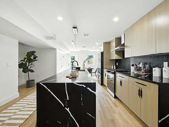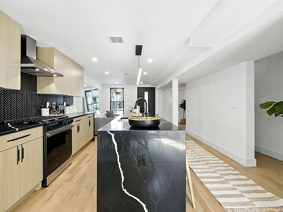 The open-concept main level is anchored by an oversized double waterfall island, seamlessly integrating defined living and dining spaces. Contemporary aesthetic, with a stylish powder room on main floor. The chef’s kitchen boasts bold black quartz countertops, a tiled backsplash, stainless steel appliances, and custom cabinetry, with an oversized island offering seating for four.