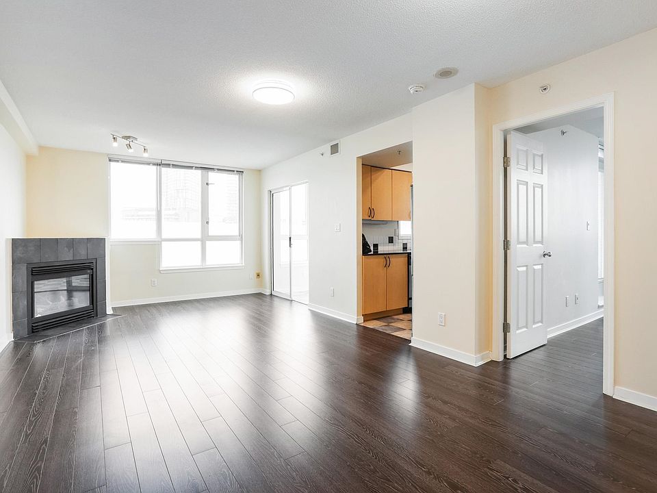 Fabulous & centrally located large 1Bd + Den in Tinseltown's Europa Bldg. This corner "05" unit seldomly comes available w/ the larger 649sqft flr pln. It features an open living space w/ a cozy corner gas fireplace, with the living rm, bedrm and balcony overlooking the courtyard, affording peace and quiet from the bustling location. The large Den suitable as a second bedroom can be flexed for use as a sunroom or office. The bright airiness of the unit due to the ample windows create a larger feel while providing the tranquility through the north shore mountain view. Galley kitchen with gas cooktop has shared balcony access from the primary bedroom. Great starter home with Air Conditioning, geothermal heating, 1 secured underground parking and storage locker. Great amenities & concierge!