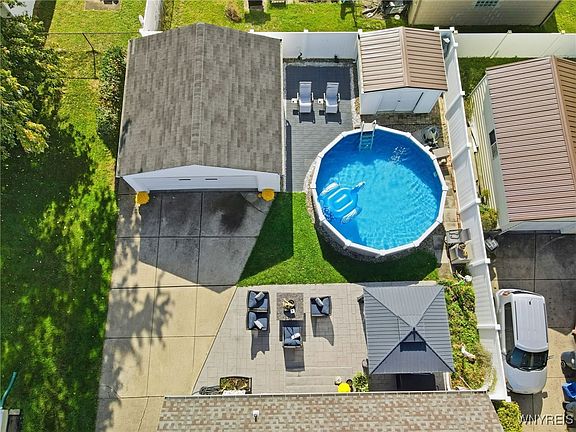 Welcome to this beautifully maintained all-brick Cape Cod located on a quiet, well-cared-for dead-end street in Lackawanna. Just minutes from the thruway, this home offers quick access to both downtown Buffalo and the surrounding suburbs. Step inside to a sun drenched family room with large window, hard wood floors and neutral wall color, which flows to the eat-in kitchen with beautiful cabinets, brand new appliances (negotiable with sale) and opens through new sliding glass doors to a stamped concrete patio. The backyard is a true retreat— fenced and private, complete with a new heated pool, ideal for entertaining or relaxing on summer days. The main floor offers two spacious bedrooms and a full bath with tiled wall tub. The third bedroom is upstairs along with a versatile bonus space perfect for a sitting area, reading nook, home office, or vanity set up. This bedroom easily accommodates a king-size bed and features a recently updated ensuite half bath (2025). Attic spaces off the bed offer additional storage or future finishing potential. Comfort and efficiency were top priorities in recent upgrades: