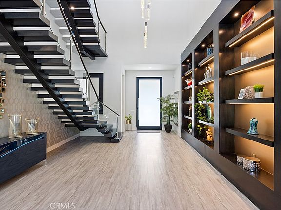 A series of high-end upgrades has shaped this stunning modern Irvine residence into the sophisticated home of your dreams! Every inch of the interior exudes contemporary elegance, from the designer wallpapers, chic lighting, and tall ceilings to the custom built-ins and gorgeous luxury vinyl plank flooring. A striking linear fireplace with stacked-stone surround anchors the living room, where expansive pocket glass sliders disappear from view to seamlessly blend your indoor/outdoor entertaining areas.
