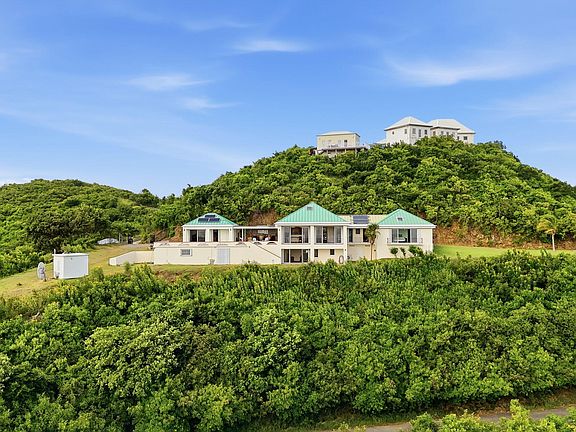 Sustainable, expansive views, and serene--this beautifully designed pod-style home offers the best of island living. Equipped with SOLAR power and net metering, a backup generator, solar hot water, UV water filtration, and storm shutters. Inside, you'll find a thoughtfully laid-out floor plan that combines function and the best of Caribbean living. The kitchen features granite countertops and plenty of workspace, situated parallel to the living and dining areas which are framed by large sliding glass doors that take full advantage of the 180 degree view. Just steps away, the inviting pool and patio create the perfect setting for entertaining, lounging, or enjoying the island breeze with panoramic south shore views. The main home includes a dedicated office area, ideal for working remotely or managing day-to-day tasks, and a separate downstairs apartment that provides excellent options for guest accommodations, rental income, or an in-law suite with its full kitchen and AC. Comfort and efficiency is at the forefront with split A/C units in the bedrooms, a spacious utility room, and multiple storage areas throughout.