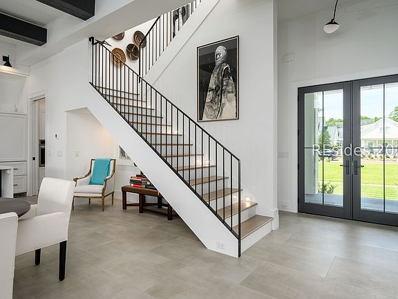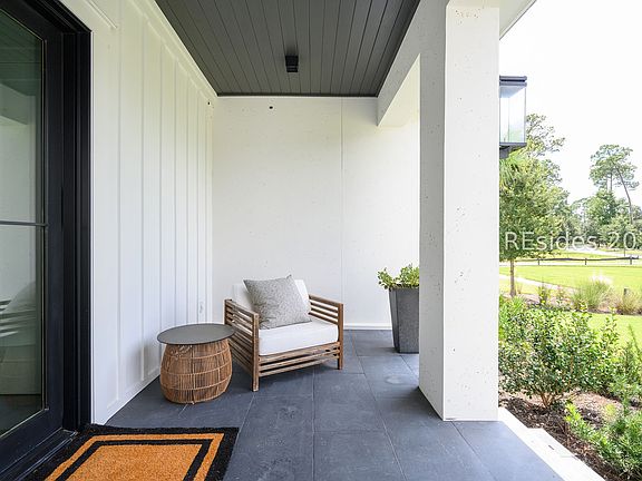 63 Marsh Rabbit Street is a three-bedroom, three-and-a-half bath modern Lowcountry-style home in the highly desirable River Road neighborhood of Palmetto Bluff infused with contemporary style and enjoying tranquil park views from its wide front porch. Set in the very heart of River Road, the property offers amenities like the Palmetto Bluff Dog Park and The Lodge at Palmetto Bluff just a short walk away. Crafted by Blackwater Construction Group from a design by renowned architect John Pittman, the home's thoughtful layout blurs the lines between indoors and out, with light and airy living spaces that transition seamlessly into a delightfully private inner courtyard. Throughout, dramatic contrasts between crisp white millwork and darker accents cut a sophisticated profile that complements the outdoor beauty perfectly. The flow of the main living spaces creates the ideal environment for entertaining, with an open living room topped by eye-catching exposed beams transitioning both into the kitchen and out toward the screened porch. With a soaring slate hearth as an appealing accent, its spaciousness flows into the gourmet kitchen, passing around the waterfall edge of the quartz countertop to wide counters housing state-of-the-art appliances. A back kitchen transitions into a spacious pantry, wine cellar and laundry to create unparalleled function to go with the beauty of custom cabinets and luxurious finishes. A multi-slide panel wall of glass along one end opens wide to blend the living room with the broad screened porch for year-round indoor/outdoor living, guiding out to a brilliantly contemporary outdoor living space. With a gas fireplace at one end, a full outdoor wet bar and grilling patio at the other, and tranquil views of the courtyard throughout, it is a true oasis of outdoor living. Beyond that courtyard, dual one-car garages with a golf cart port offer ample storage out of sight. The ground floor primary suite indulges with extra spaces, including a secluded greeting room with desk, bedroom set behind pocket doors, two massive walk-in closets offering a wealth of custom built-ins, and an idyllic ensuite bath with soaking tub and pass-through shower. A pair of full suites with spacious closets flank a flex space on the second story, with one giving way to the remarkably roomy walk-in attic.