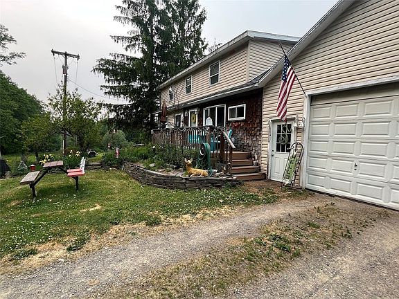 Private Country Living. 3 bedroom 1 full, 1 half, 1 quarter bath home located on your own private 8.98 acre lot. 1st floor bedroom, large eat in kitchen, dining room with sliders to your covered porch and open deck, and a living room with a pellet stove and access to the front deck. Up the spiral staircase there are 2 bedrooms plus a bonus area with closet storage. The other bonus room opens onto a small deck with views of your property. There is a half bath with the plumbing to add a shower. The basement has the laundry with 1/4 bath, large unfinished area with a pellet stove (not even a year old) that could easily be finished. Newer furnace. Oversized 30x28 attached garage with enough room for the vehicles and the toys. This affordable fixer upper is located near access to I88 and less than a half hour to Binghamton. GPS is incorrect - please do not try to do a drive-by, the property cannot be seen from the road. Contact your realtor for directions and a showing.