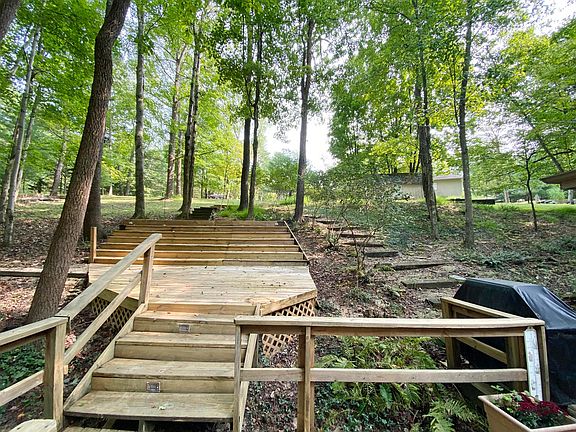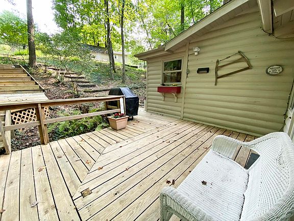Cozy-plus build in the early years of Hide-A-Way Hills Club, recent updates include large kitchen plus year-round porch room. Lots of deck space front & back, hot tub alcove off finished walkout lower level. Grand great room design with multiple skylights, wood flooring across main level as well as porch. Covenient access via two driveways, 2 lots for plenty of play & recreation space. 3-car garage with electric & water service, openers, workspace, windows, pllus XXL side parking space suitable for RV's. Cathedral beamed wood ceilings, fans, 2 rear deck walkouts. Recent new full bath in LL, plus updated main level full bath. Newer dimensional roof w/added insulation, half-log siding, storage shed. Inviting convenient setting, close to main entrance, park, boat docks, fishing lakes & golf.