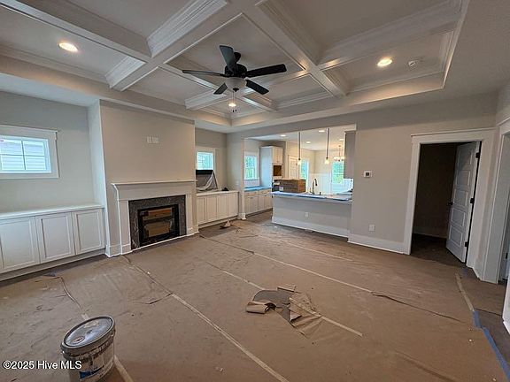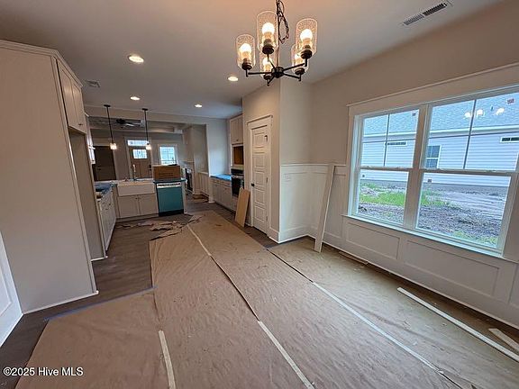 Popular Songbird in Hampstead and The Holly home plan in the Farmhouse Elevation are sure to please. This single story home is 1671 sq. ft. with 3 bedrooms and 2.5 baths and a sunroom. Structural options and upgrades include q sunroom off dining room with glass pocket doors, prestige kitchen featuring wall oven and separate cooktop with hood, coffered ceiling in great room, bench with hooks in mudroom, white wood shelving in owners closet and pantry, upgraded flooring throughout, frameless shower door and side wall bench in owners shower, upgraded quartz countertops throughout, craftsman trim package, marble fireplace surround, built in base cabinets on each side of fireplace.