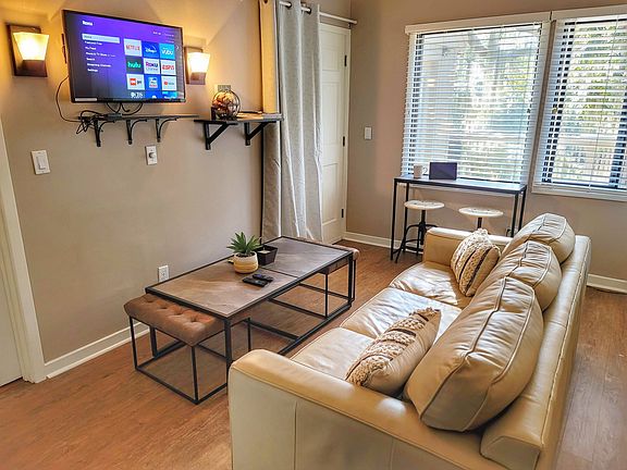 The living space is furnished with a comfortable, light-colored sectional sofa, perfect for relaxing. A stylish coffee table sits centrally, complemented by a tufted ottoman that can provide extra seating or a place to prop up your feet. Entertainment is readily available with a wall-mounted flat-screen TV.
