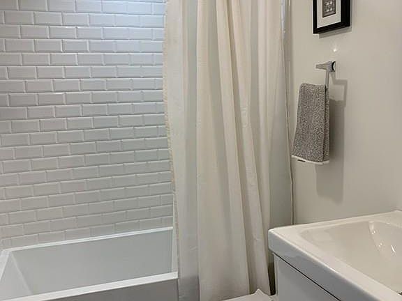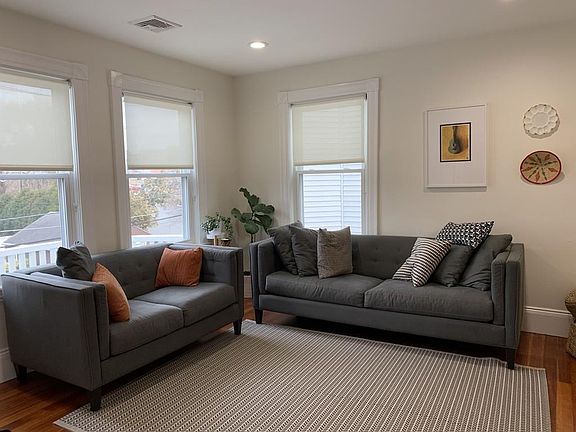 Clean, light filled, recently renovated two floor apartment; main floor (on second level) has private entry stairs, full bathroom, living room, dining room, kitchen, laundry area, pantry, and bedroom with private bathroom. Upper floor (on third level) includes 2 bedrooms and a living area. Kitchen has white granite counters, white cabinets, stainless appliances including range/ micro hood, dishwasher, garbage disposal, side by side fridge, and large island with seating for 4. Heart pine (hardwood) floors throughout, large windows, central air/ heat and on-demand water heater. One off street parking space, plus additional spaces available two doors down for rent during winter months (Watertown does not allow overnight street parking in winter). Maintained front yard and common back patio shared with first floor unit, snow removal included. Easy commuter location to Boston, Cambridge, Newton, Mass Pike, Express bus from Watertown center, additional bus lines to Cambridge, etc