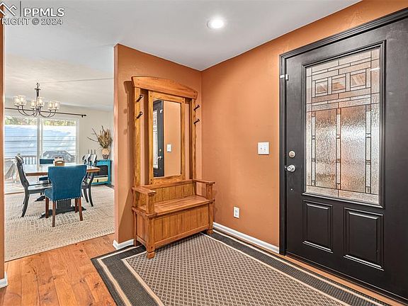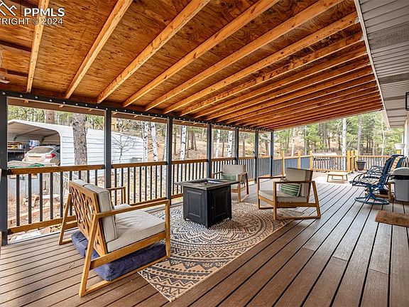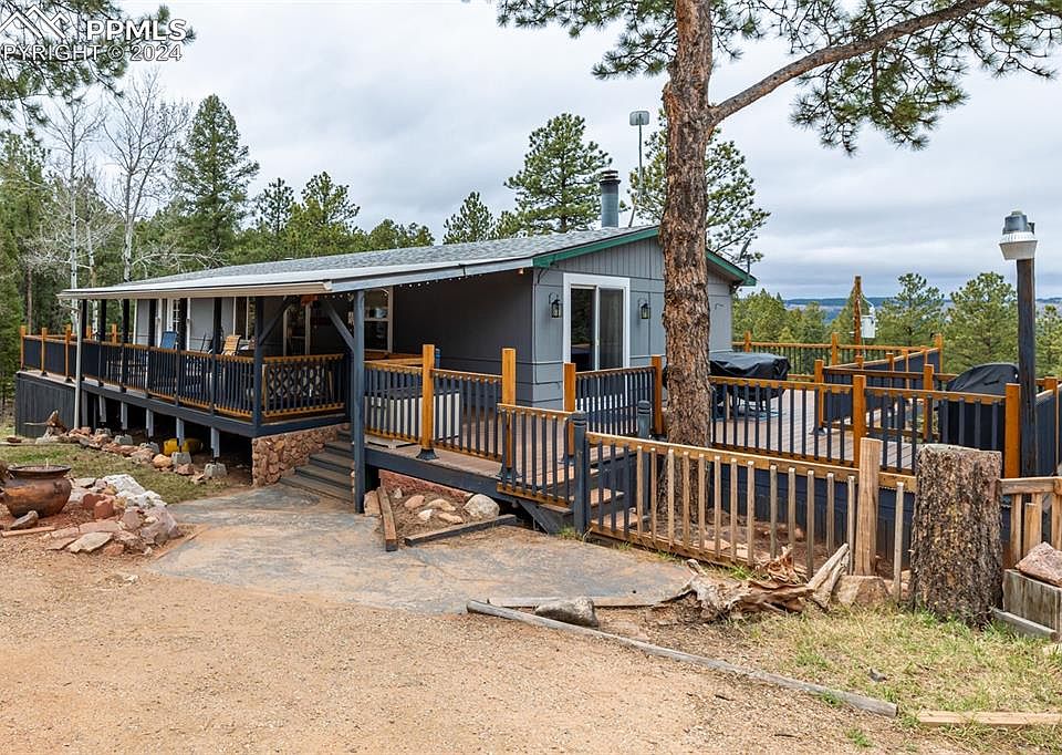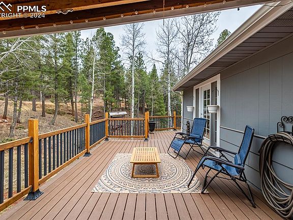 Beautiful property with stunning mountain views in the Ridge Wood subdivision outside of Woodland Park! Discover a delightful floor plan with wood floors, built-ins in the living room, a fireplace with stone walls & deck access in the dining area, & modern light fixtures. The kitchen has a pantry, an island with a breakfast bar & wine cooler, stainless steel appliances, a hanging pot rack, a stylish backsplash, & granite counters. Light & bright primary suite includes a French door to the deck & a full bathroom with a soaking tub, glass enclosure shower, & a walk-in closet. Downstairs, you'll find an ample family room with another pellet stove and sizable secondary bedrooms. The backyard backs up to the Pike National Forest and features a hot tub, a fenced yard area, & a firepit area. Enjoy the views from the wrap-around deck or covered patio! Seize this opportunity before it slips by!