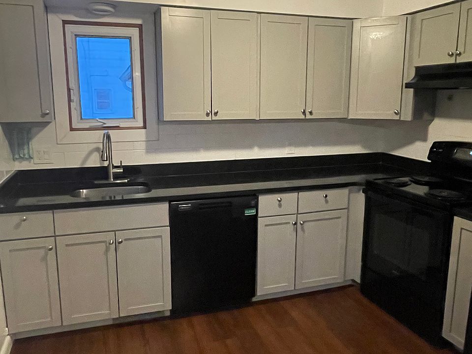 Freshly renovated kitchen with updated cabinets, sleek countertops, and black appliances (stove, fridge, dishwasher included)