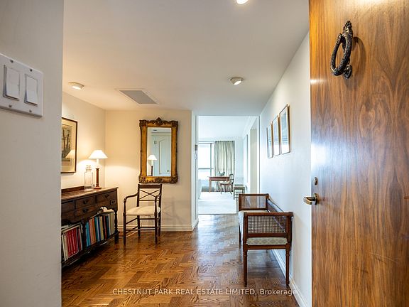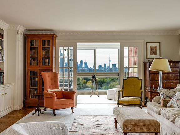 Rare offering at Granite Place. South, West, and North views from the 10th floor, enjoying nearly 2600 square feet of living space. Gaze across the treetops to the CN Tower and onward to the lake. Watch the incoming weather, the changing skyline, and the twinkling night lights. The Suite feels like a large home with room for entertaining, art, and a lifetime of collectibles. The Foyer welcomes you into this elegant and open space. The transitional style combines traditional comfort with expansive, open, and light-filled design. The living room opens wide to the sunroom with balcony walkouts in both rooms. The long hallway to the primary creates a private retreat with a large sitting area, dressing room, and bath, as well as a large dedicated balcony. On the theme of privacy, the 3rd and 4th bedrooms are set in the south wing, both enjoying enchanting views and a dedicated 4-piece bath. Yes. The suite has 4 Bedrooms, currently used as 2 plus 2 large offices, and 4 bathrooms *. Closets are abundant throughout with organizational systems and shelving. If you still need more storage, 2 large lockers are also included for exclusive use. 2 Parking spots are owned and in a prime location on A level near the entrance. The laundry room has a wash sink, large storage cupboards, and even a dedicated entrance. Granite Place offers a gentile lifestyle set away from the rumble of St Clair behind in a mature, treed, and private park setting, with an attentive concierge staff, salt water pool, gyms, sauna, event room, and a soon-to-be completed and highly anticipated renovated lobby.