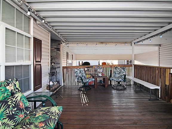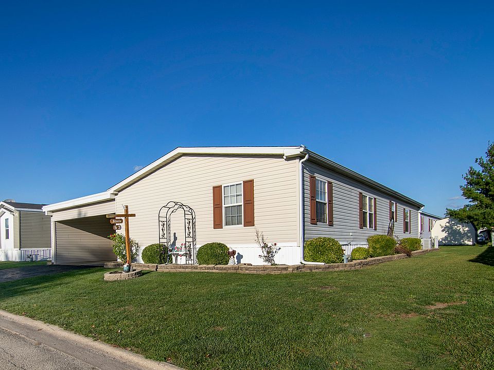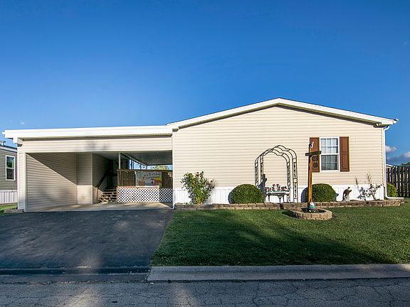 Really well maintained home just under 1700 sq ft. Has incredible 30x12 deck the majority of which is covered and lit up, perfect for hanging out in all times of day or night, rain or shine. Deck also wraps around to the back entrance. Two sheds, carport, and nice landscaping are also bonus features; south side of the house is adjacent to one of the neighborhood parks. Inside you have a house that looks much newer because it's been well cared for, flooring is mostly wood laminate. Open floor plan makes it feel spacious. Plenty of kitchen cabinets. Counters were replaced a few years ago. Kitchen has stainless steel appliances and a pantry as well. There are two eating areas for tables, but one could be used as an office near the laundry room. Furnace and a/c are only 4-5 years old. Each bedroom has a walk in closet with the master suite having the largest closet of course. The master bathroom has a separate shower and a whirlpool tub. Home comes with security cameras. One owner home, well loved. Some furniture could be sold to or left for next buyer with the right price. Park amenities include a clubhouse, pool, and exercise room.