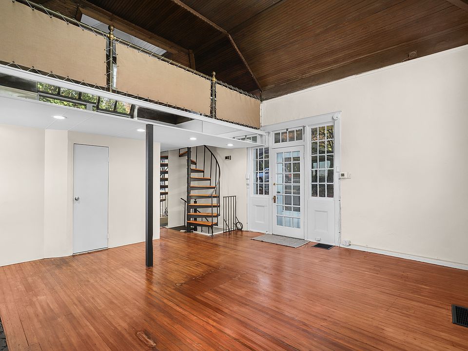 living area with access to a sundeck , renovated full Bath and Spiral staircase to bedroom loft .