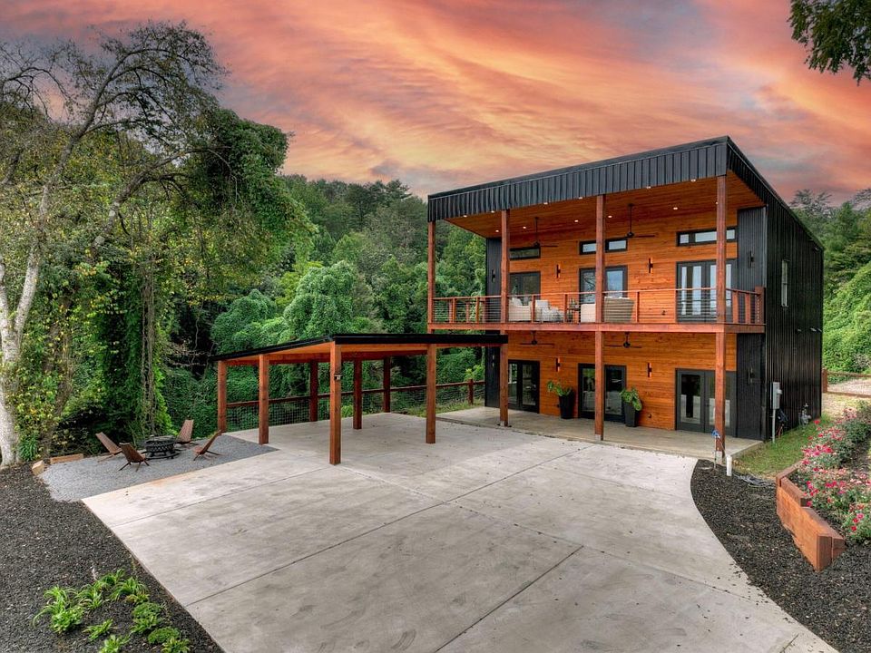 Welcome to this modern rustic home right in the heart of downtown Ellijay now complete with updated inside photos! Walk to restaurants and shops from this stylish, unique, and upscale home. This 3-bedroom, 3-bath, and 1-half bath home offers convenience with rustic charm and long range year round mountain views! Enjoy a paved driveway, covered parking, fenced yard, and oversized deck areas to take in the views and city lights at night. This modern cabin offers a touch of rustic with high end and contemporary finishes that include an industrial concrete floor, granite counters, custom wood cabinets, 2 fireplaces, a master bedroom on the main floor, and tile showers, and a wet bar on the upstairs level. Glass doors open to the spacious decks from every room on both levels. Have the best of both worlds with a downtown cabin boasting extraordinary views on a large and rare to find .97 acre lot and in walking distance of downtown Ellijay.