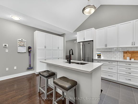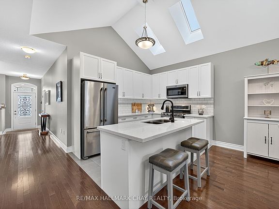 Stunning Bungalow Townhome in the luxurious adult lifestyle community of Briar Hill! This "like new" home has been immaculately maintained and updated by the original owner. The bright, open-concept main floor features soaring vaulted ceilings, two skylights, and an oversized patio door that fills the space with natural light. Enjoy hardwood floors and an upgraded trim package throughout the main level, including the spacious primary bedroom. The modern white kitchen boasts quartz countertops, a large island, and an upgraded pantry wall offering ample storage. The primary suite includes two closets and a private ensuite bathroom. A versatile front den provides flexibility to suit your lifestyle-perfect as an office, gym, sitting room, or second bedroom. The garage offers both inside access and direct backyard access for maximum convenience. The peaceful, private backyard features a raised deck and lower interlocked patio, ideal for entertaining or relaxing. Fully finished basement includes oversized above grade windows, guest room retreat, a spa-inspired bathroom with an upgraded Jacuzzi tub, a cozy rec room with a gas fireplace, a full-sized laundry room with a sink, and a massive storage area. Nat Gas BBQ Hook Up. Custom Window Coverings. Garage Door Opener. Professionally Painted. Located in a scenic, quiet community surrounded by golf courses and rolling hills, this property combines comfort, convenience, and an active lifestyle. Condo fees cover exterior maintenance including windows, roof, driveway, snow removal, and lawn care.