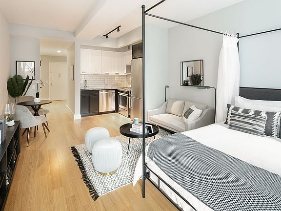 Spacious studio beautifully outfitted with custom white cabinets and stainless steel appliances. The bathroom has wall to wall Italian Marble and a modern vanity. A washer dryer is included within the residence for your convenience! Images represent the finishes of the apartment.