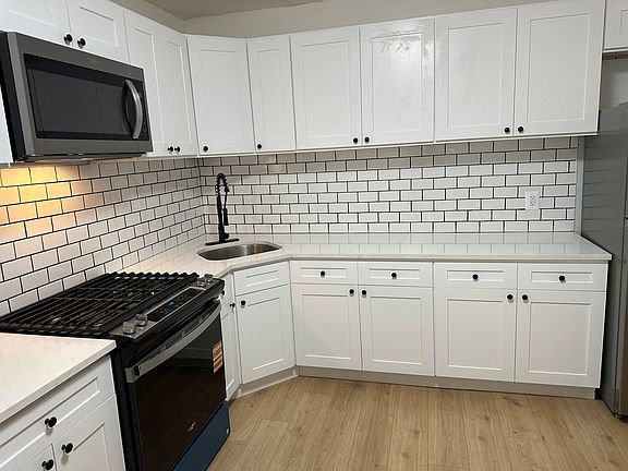 - A fully equipped modern kitchen with brand new quartz countertops, self closing kitchen cabinets, refrigerator, gas range, and microwave for all your cooking needs.