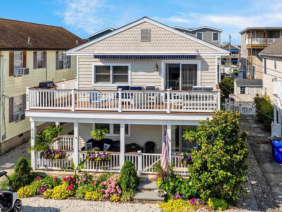 630 21st Street, the perfect starter property on the 7 Mile Island. This fully furnished and move-in ready, top floor condo is beautifully appointed and has had many updates over the years. It features 3 bedrooms and 1.5 bathrooms, with recent improvements such as custom built-in bunk beds, a built-in king bed with storage drawers below, floating nightstands and custom armoire with drawers all crafted by renowned Scull Woodworking. The updated kitchen has quartz countertops, stainless steel appliances and a center island with seating. The living area has a stylish built-in wet bar for entertaining guest and leads out to a spacious wrap around, newly built deck in 2022, with awning to enhance your living space. The space in this condo has truly been maximized. The exterior features 2 car parking, a southern exposed rear back yard with a large shed for plenty of storage and space for a 4-person golf cart, also a private outside shower. This special site is only a short stroll or golf cart ride to the public dock off 6th Ave, breathtaking sunsets at the end of 21st street, the center of the Avalon business district, sandy white beaches and much more. Meticulously maintained and never rented; however, would be an excellent rental property if desired. Other recent improvements include a new dishwasher in 2022, new washer and dryer in 2021, new nest smart thermostat in 2024, new AC and furnace repair in 2025 and awning was repaired in 2023. Seller prefers settlement not to occur until 9/15 but is willing to close as early as 8/15.