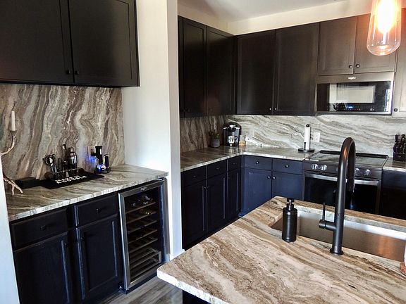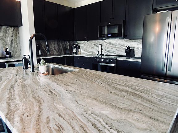 Fully renovated kitchenMassive marble slab islandNew luxury flooringCustom marble waterfall backsplashSleek black cabinetry