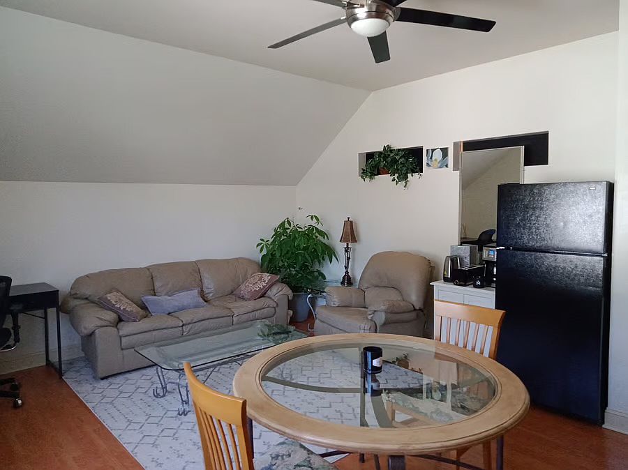 The FURNISHED 800 sqft are completely separated from the rest of the house with an individual keyless entrance door. The main room features a kitchenette with dining table, breakfast bar, leather sofa and one "to sleep in" recliner, office computer desk with armchair and a 55" Samsung smart TV.