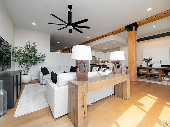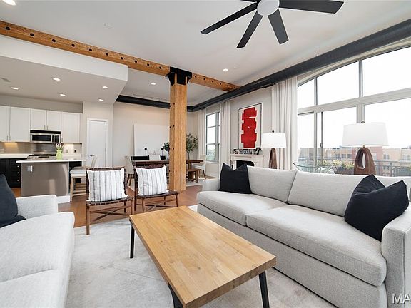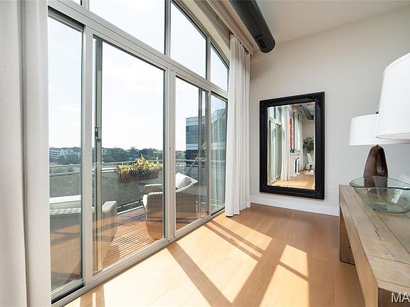 Sophisticated top-floor 2 bed, 2 bath residence in desirable Creve Couer. Soaring 11-foot ceilings and new hardwood flooring elevate the open-concept layout, complemented by a private balcony with peaceful views of the pool & courtyard. Sleek floor-to-ceiling windows bathe the interior in natural light, enhancing the home’s airy and contemporary feel. The designer kitchen features 42” cabinetry, quartz countertops and stainless steel appliances. The primary suite includes a spacious walk-in closet with custom features, an updated bath with custom cabinetry, dual sinks, a separate shower and soaking tub. This unit also provides a spacious laundry room with washer & dryer. Two assigned spots in a climate-controlled garage with private storage. Amenities include a heated pool, elegant clubhouse with full kitchen and entertaining space, outdoor fireplace lounge and kitchen with bar seating. The serene, stairless environment offers true one-level living with secure entry and dual elevators.
