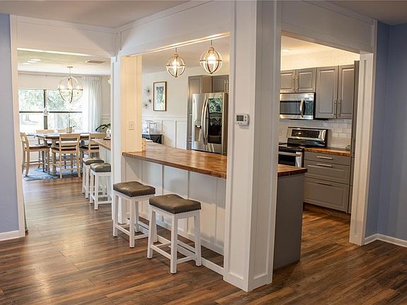 If you are looking to upgrade to a country club lifestyle then you very well may like this 3 bedroom, 3 bathroom updated, pool home that is now available for purchase in Lone Palm Country Club. Situated on over 7/10th of an acre, this beautiful Florida home will give you the new life you deserve all while soaking in the gorgeous gold course view. Immediately, upon arrival you’re taken back by the double circular driveway which gives tons of parking for friends, family, and guests. When you enter the double doors at the front the open floor plan gives a very large and airy feeling. The beautiful updated wood look floors flow seamlessly into the great room where you can relax, or you can head out to the covered lanai and take a splash in the pool. The huge, butcher block island greets you as you enter the kitchen and dining room spaces. The beautiful gray cabinetry with lots of built-in drawers and pullouts make this kitchen ideal for anybody who likes to entertain, bake, or cook. The separate dining area at the back has a beautiful view of the golf course and gives you ample space for casual or more formal dining. The laundry area doubles as a study. There are built-in cabinets, drawers, more butcher block countertops, and a laundry tub down one side, and, where the old-fashioned water heater was replaced by a sleek, tankless water heater, there’s enough room for a desk, built-in shelving and extra storage. The split bedroom design means that the master suite is tucked away to the left of the property, has a very nice sized sleeping area, with enough space for your king size bed and furnishings. You will love the updated bathroom with butcher block tops, top mounted trough sinks, and very nice marble tile that all leads to the walk-in shower. The walk-in closet also includes several built-in custom features giving you much more storage than a simple shelf and rod. The secondary bedrooms are adorable. They are on the right hand side of the home. They both contain built-in closets TV mounts and in the middle of the two rooms there is a beautiful updated bathroom with marble tile, a double cabinet vanity, an updated shower surround with niches and built-in linen closet. The backyard is to die for. There is a large 33 feet wide, covered back porch with enough space for seating areas under the fans, a place where you’ll absolutely love to relax in the mild Florida Winters. There is a full bathroom outside by the pool with a sink, toilet and shower with its own tankless water heater. The screened in cage pool area overlooks the golf course, so if you’re looking to cool down, sunbath, or enjoy the nature of your surroundings, this is the place to be. Please have a look at the photographs, take a virtual tour, and when you love what you see request a showing. You do not want to miss out. This gem of an updated home will not last long. Did I mention that it sits on .72 acres? You’re not on top of your neighbors and you have plenty of private space. This is the country club lifestyle you deserve. *** UPDATES and MAINTENANCE: Major updates occurred in 2018-2019. Updated kitchen with gorgeous butch block tops. Updated bathrooms. Updated flooring. Repiped in 2023 (still under warranty). Tankless water heater added in 2024. Interior panted. Exterior painted *** BONUS: The sellers are offering a home warranty for the first year with an approved offer. Don't miss out on an amazing lifestyle upgrade, request a showing today!