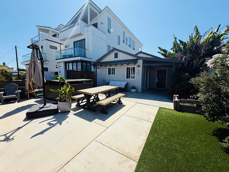 The outdoor spaces are just as inviting. Enjoy your private front yard with lush landscaping, fruit trees, and an above-ground jacuzzi tub perfect for unwinding after a surf session. Rinse off in the outdoor shower and store your surfboards in the side yard designed for coastal living.