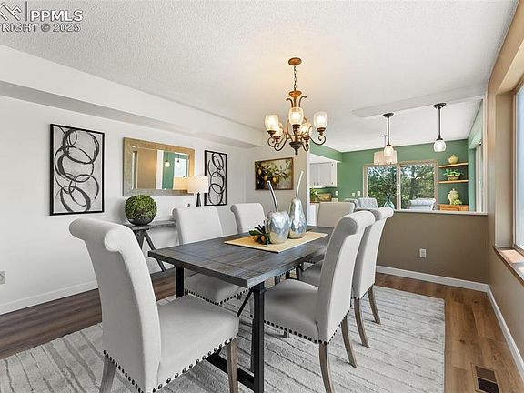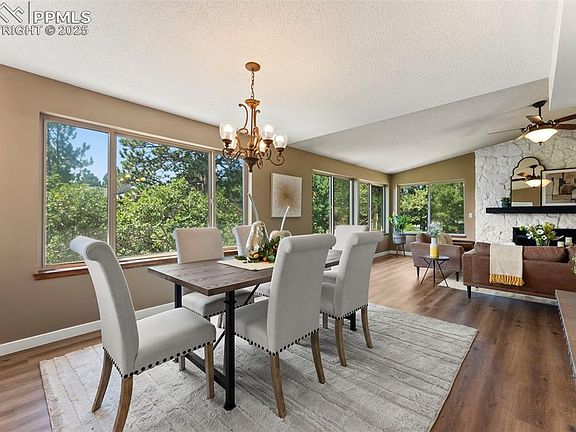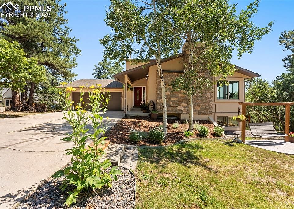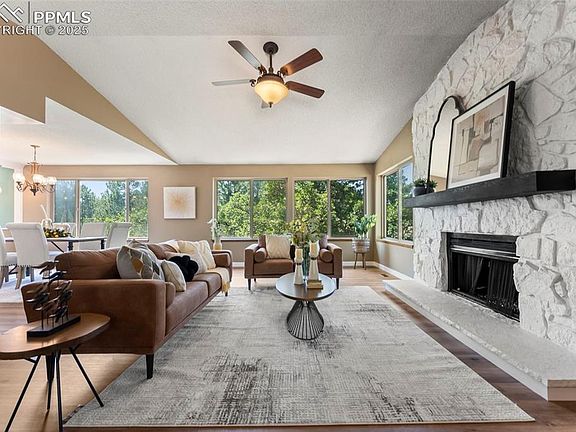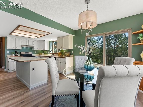 Nestled on a serene cul-de-sac and backing to open space, this beautifully maintained 4-bedroom, 4-bath stucco and stone home sits on a private, treed ½ acre lot offering peace, privacy, and majestic views — all located right near Hole 15 of the prestigious Woodmoor Country Club golf course. Step inside to an inviting Great Room with vaulted ceilings, brand new LVP floors on the mail level, and a stunning rock fireplace — the perfect space to relax or entertain. The open layout flows seamlessly into the spacious dining area and kitchen. Step out from the kitchen onto a gorgeous Trex deck overlooking the lush greenbelt. The upper level features two bedrooms and two baths, including a spacious master suite with vaulted ceilings and an attached bath. The second upstairs bedroom boasts a large walk-in closet with a nearby full bath. Downstairs, the walkout basement offers a cozy family room with a gas fireplace, a wet bar, two additional bedrooms, and another bathroom. Located in desirable North Woodmoor, this home offers a tranquil, country feel just minutes from I-25, shopping, and top-rated District 38 schools. Impeccably maintained and move-in ready — your dream home on the green awaits!