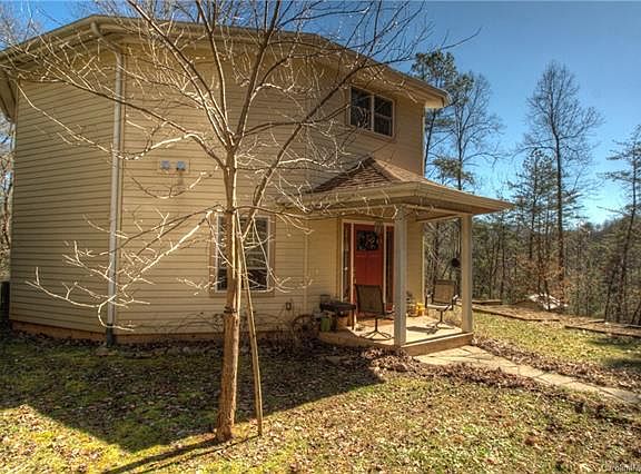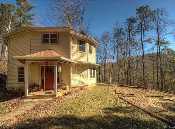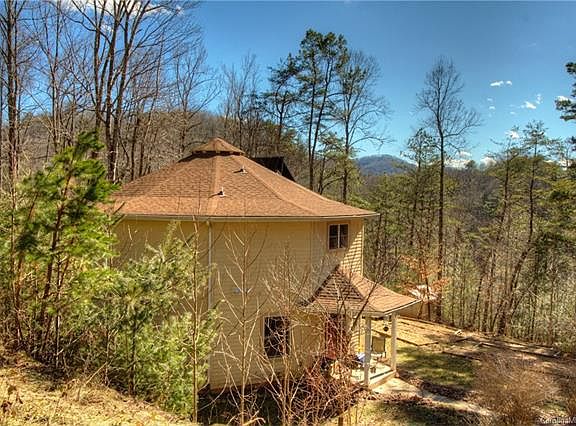 Charming 2-bedroom, 2-bath home, built in 2007 by local Asheville builder Deltec Homes; this unique, circular designed home is situated in a picturesque and quiet mountain neighborhood on 1.14 sunny acres. Open living, pine trim, stained concrete floors, tiled bathrooms, bedroom loft, and other architectural touches. Passive solar design/south-facing windows let the sun's warmth in during winter and out during the summer. Solar collectors backed by electric water heater provide efficient water heating. Insulated slab and highly insulated walls and roof, Energy Star electric appliances, and energy efficient doors and windows; All low/no VOC materials, and Perfect Barrier mold and termite protection for excellent indoor air quality. Raised bed gardens, storage shed, and forest completes this home's appeal. Minutes to Waynesville w/quick I-40 access, Super close to summer and winter recreation including the Pisgah National Forest, ski area, Waterville Lake, Pigeon River, GSM Nat'l Park.