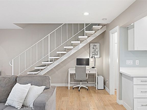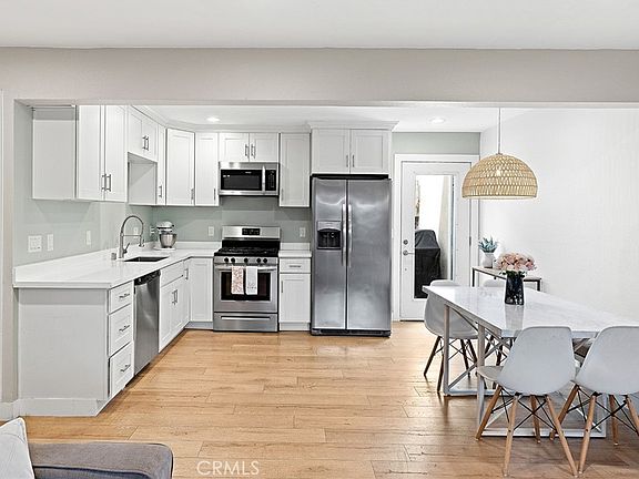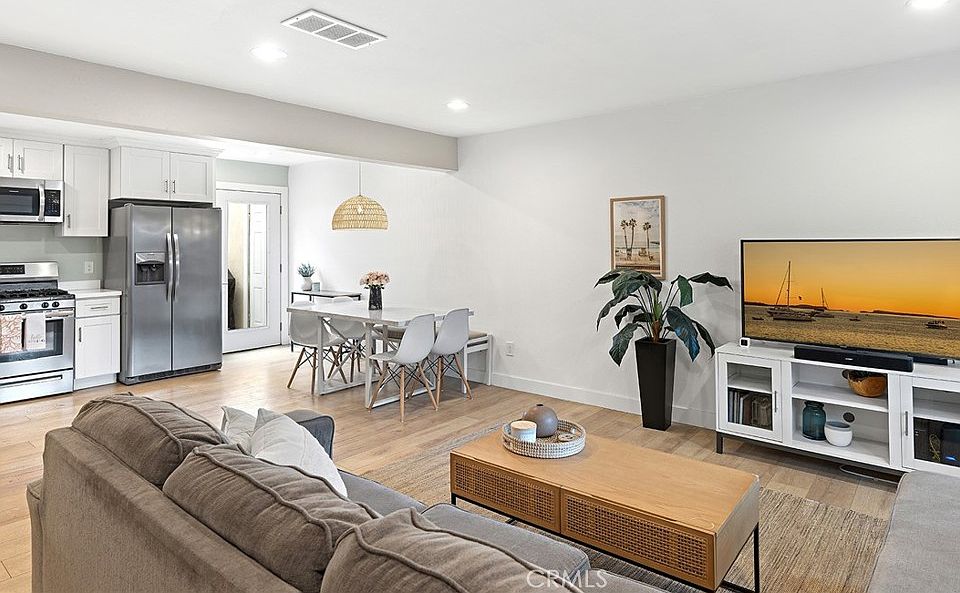 Welcome to this beautiful, two bedroom, two bath condo nestled in the serene, gated community of Coco Palms. An airy, light-filled floorplan with recessed lighting awaits, creating a modern and inviting atmosphere. The fully remodeled kitchen is open to the dining and living areas, featuring a suite of quality stainless appliances, white cabinetry, sleek countertops and beautiful modern fixtures. The thoughtful main-level layout offers space under the stairs to create an office nook or storage space. Each bedroom is generously sized with ample storage space, including a dual his-and-hers closet in the primary suite, as well as great natural light and double-door closets in the secondary bedrooms. Bathrooms boast white cabinets and chic, contemporary fixtures. Enjoy private outdoor living on the patio, where you can relax with plenty of room for entertaining. In-home laundry is conveniently located in an enclosed area off the patio. This property is one of only eight in the community with a two-car garage, granting you the convenience of extra storage space. In addition, you will have one assigned parking lot space. You’ll love the impressive community amenities at Coco Palms, including a large pool and shared greenspace. All just moments away from dozens of great restaurants, shops and cafes, Twila Reid Park, and Knotts Berry Farm. This home perfectly blends coziness and convenience with modern amenities and a timeless aesthetic. Welcome home!