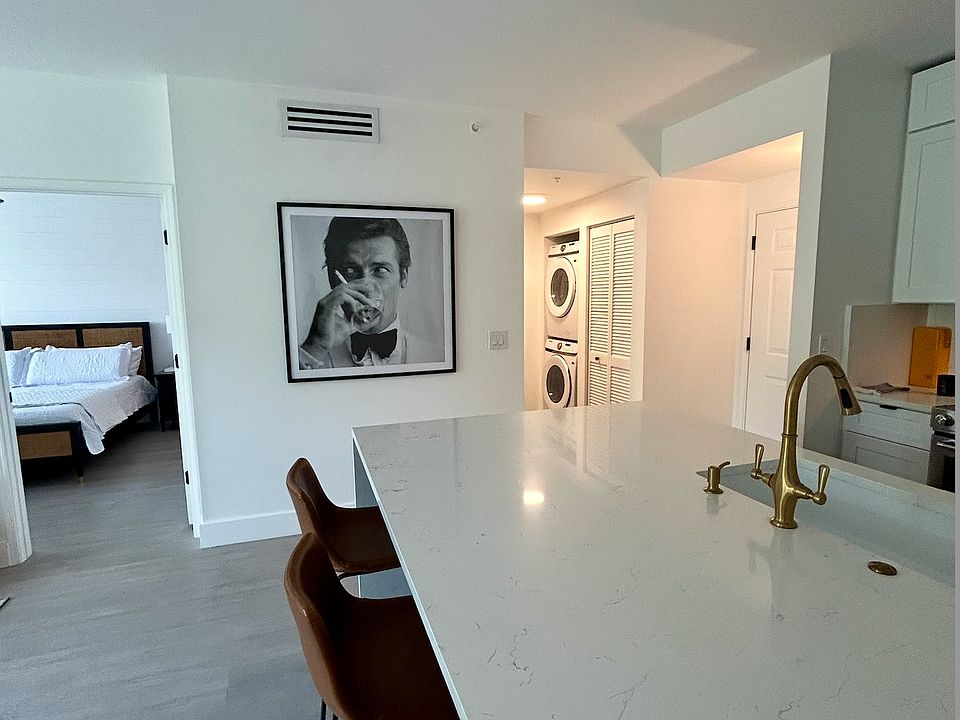 Welcome to your well appointed furnished retreat in the heart of WPB! An impeccable designer 1-bed, 1-bath w/unrivaled convenience and style. Restaurants, bars & Starbucks downstairs. Take leisurely strolls to the Intracoastal, Palm Beach Island, Clematis, & Brightline . Step inside to discover modern farmhouse elegance with Ralph Lauren touches, boasting a spacious quartz island, designer bathroom, & chic walk-in closet. Enjoy high-end appliances, two 86-inch TVs.