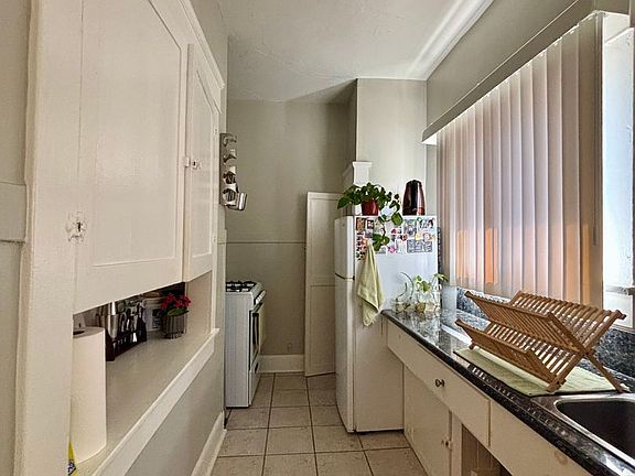 The kitchen offers generous counter space and has built in cabinets. Appliances include a refrigerator and stove.
