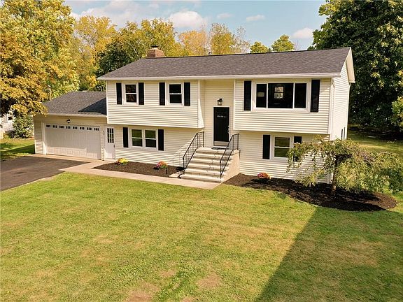 Webster Where life is worth living, says it all. This completely renovated raised ranch with TRUE in-law (or income generating rental space) on acre lot offers much more than beautiful, modern dcor & cosmetic updates. NEW Tear off roof (2020), NEW gutters (2020) NEW HVAC system (2020) NEW HWH (2020) NEW doublewide Driveway (2020), NEW Insulated garage door (2020), NEW windows (2020). Spacious rooms, architectural details. Custom designs everywhere, including iron railings & leathered granite counter tops. / All New Electrical devices including modern LED lighting throughout /hard wired C02 and smoke detectors, and the list goes on. Upper level offers Bright and Open design with stunning hardwoods, exquisite Kitchen, 3 beds and bath, lower level offers large bed, new bath, New full kitchen, living area and stone, raised hearth wood burning fireplace. Heated Additional space behind the garage amps up the sq. footage, perfect for your home office! This property will not disappoint.